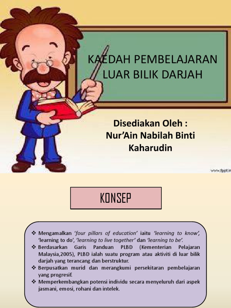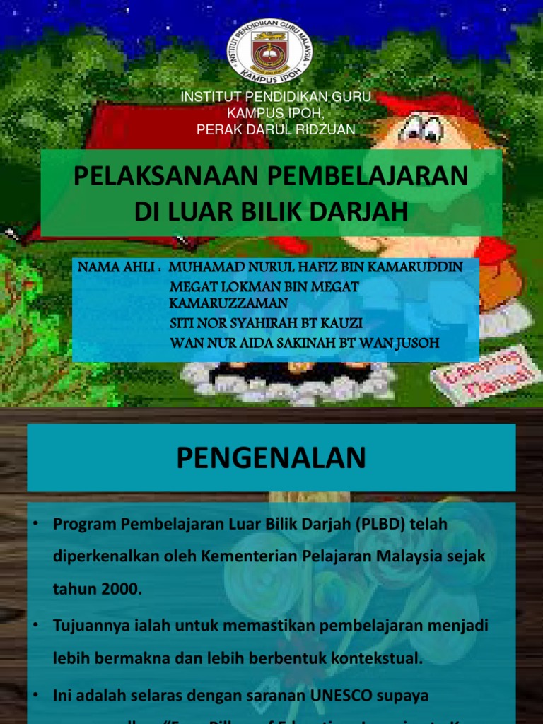 Program Pembelajaran Luar Bilik Darjah PLBD diperkenalkan pada tahun 2000 oleh Kementerian Pelajaran. View Pembelajaran_Luar_Bilik_Darjahpptx from ILMU PENDI PKPK3123 at IPG Kampus Bahasa Melayu.